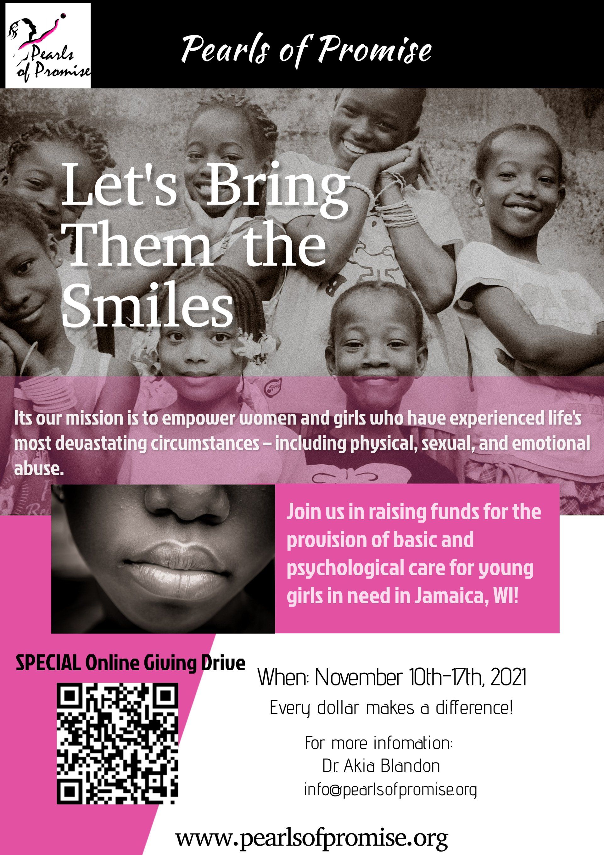 Pearls of Promise supports a Girls Home in Jamaica, hosts empowerment days, educational sessions, and provides financial support several times each year.
